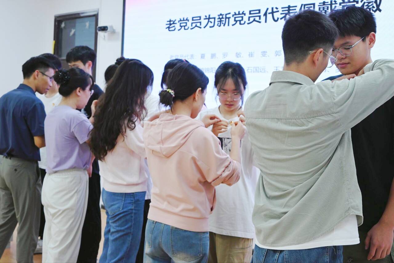 大会在雄壮的国歌声中拉开帷幕。全体与会人员肃立齐唱国歌,铿锵旋律激荡人心。随后,在李波书记的带领下,全体参会党员面向党旗庄严宣誓,老党员重温入党誓词。“我志愿加入中国共产党……”的铮铮誓言响彻会场。宣誓结束后,老党员代表为新党员佩戴党徽,红色徽章在胸前熠熠生辉,象征着红色基因的代代传承。